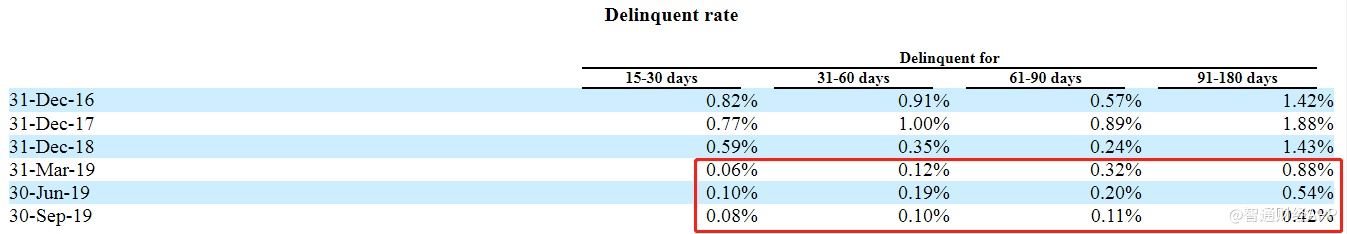 当然,在加速转型后,经营风险的降低也是显而易见的。智通财经APP发现,自2019年以来,玖富各阶段的拖欠率均有明显的改善,特别是91-180天的贷款,2019年第三季度时与2018年相比,拖欠率优化1个百分点。