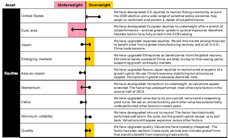 分析师表示,我们仍略微超配全球股市,因为估值看起来仍然合理,还有上涨的空间。全球制造业和贸易活动的回升,有利于投资者在战术上倾向于更多的周期性敞口,包括新兴市场和日本股市。