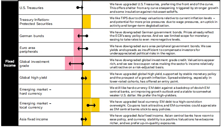 固定收益方面,贝莱德智库更看好全球高收益债券、新兴市场本币债务、以及亚洲地区固定收益的表现,均给予了超配评级。而随着欧洲区风险不确定性上升,同时市场已基本消化了欧洲央行的政策的刺激,因此,下调德国国债及欧元区外围政府债券至低配评级。