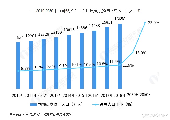 根据前瞻产业研究院数据显示,从1990年开始,中国的生育率就已低于人口正常更替所需要的水平,2000年便步入老龄化社会,并且正在朝着深度老龄化社会快速迈进。中国65岁及以上老人占总人口的比例从1980年的4.7%提升到2018年的11.9%,预计未来将继续提高到2030年的18%、2050年的33%。