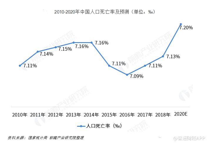 随着老龄化人口的增加,我国人口死亡率死亡也将有所上升。据国家统计局数据,2017年中国死亡人口数量为986万人,人口死亡率为7.11‰。2018年中国死亡人口993万人,人口死亡率为7.13‰。随着老龄化人口的增多,预计到 2020 年我国人口死亡率会有小幅上升,达到7.2%左右。