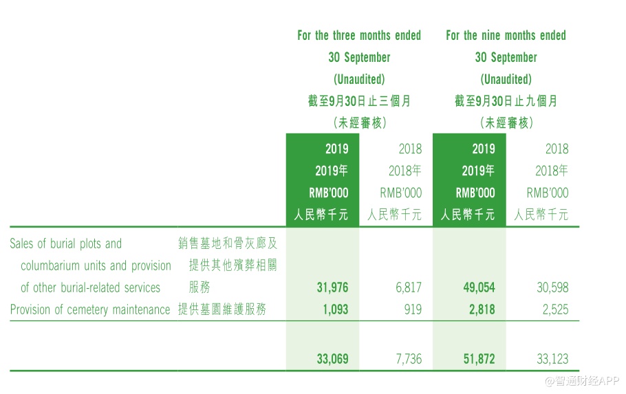 中国万桐园透露,其营业收入的增加主要是由于殡葬服务收入的增加。殡葬服务是中国万桐园营业收入的“大头”,主要包括销售墓地及骨灰廊,营收占比超过94%。2019年前三季度,该业务实现营业收入4905万元,同比增长60.3%。净利润的减少主要是因为行政开支和税务开支增加,行政开支大增156.7%是因为转板产生的费用,税务开支大增74.8%是因为金融资产之公平值变动亏损导致递延税项抵免增加。