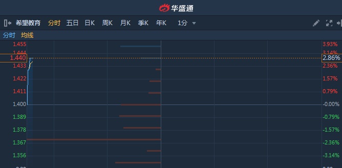 智通财经APP获悉,希望教育(01765)市前现一宗大手成交,每股作价1.302元,涉及7526.88万股,涉资9800万元。截至9时35分,涨2.86%,报价1.44港元,成交额9844万。