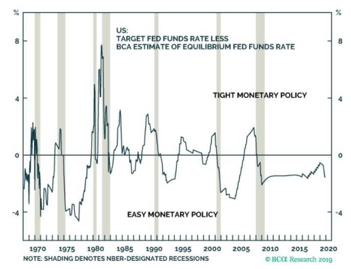 下图表显示了1970年代以来中央银行联邦基金利率的轨迹,并突出显示了美股目前在“宽松货币政策”类别中的地位。