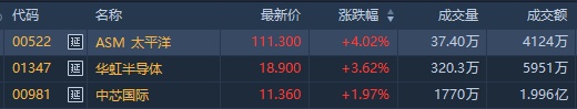 截至发稿,华虹半导体(01347)涨5.92%,报19.32港元;ASM太平洋(00522)涨4.49%,报111.8港元;中芯国际(00981)涨1.97%,报11.36港元。