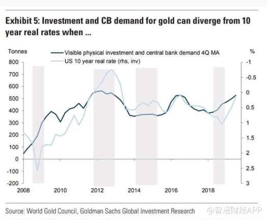 高盛指出,黄金看起来很有吸引力,尤其是相对于德国马克债券。债券和黄金都是防御性资产,当恐惧加剧时,它们的价值就会上升。下图显示,投资和央行对黄金的需求与美国10年期实际利率高度相关。