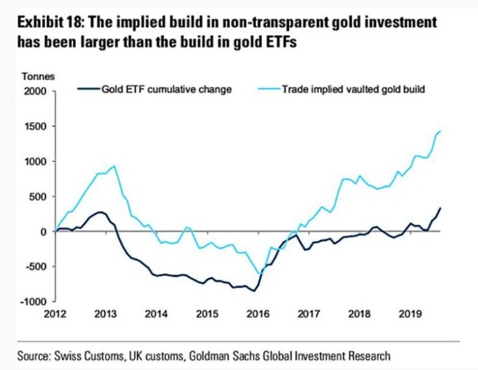 高盛在报告中表示,“自2016年底以来,非透明黄金投资规模一直远大于有形黄金ETF的规模。这一数据与全球金库需求激增的报告相符。”