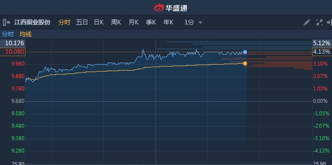 智通财经APP获悉,江西铜业股份(00358)获控股股东提供15亿元贷款。该股盘中再度放量走高,创四个月新高,暂现六连阳累计涨幅达11%,截至14时44分,涨4.13%,报价10.08港元,成交额6580万。