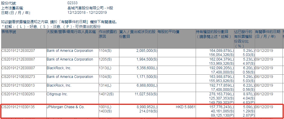 智通财经APP获悉,联交所最新资料显示,12月6日,摩根大通增持长城汽车(02333)899.0952万股,每股作价5.8861港元,总金额约为5292.16万港元。增持后最新持股数目约为1.58亿股,最新持股比例为5.09%。