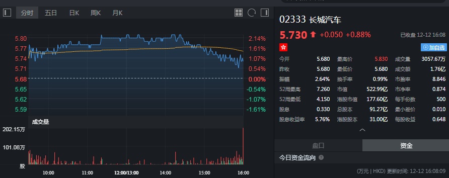 截至今日收盘,长城汽车涨0.88%,报5.73港元。