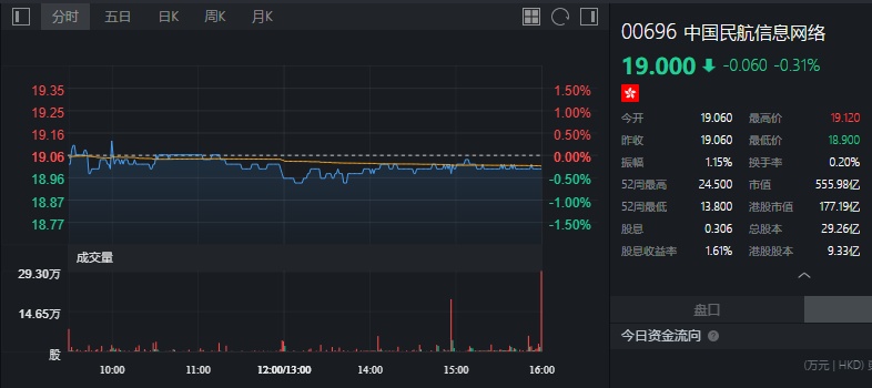 截至今日收盘,中国民航网络跌0.31%,报19港元。