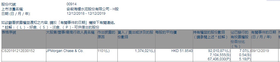 智通财经APP获悉,联交所最新资料显示,12月9日,摩根大通增持海螺水泥(00914)137.4021万股,每股作价51.8540港元,涉及总金额约为7124.85万港元。增持后最新持股数目约为9201.09万股,最新持股比例为7.07%。
