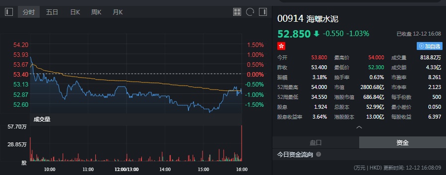 截至今日收盘,海螺水泥跌1.03%,报52.85港元。