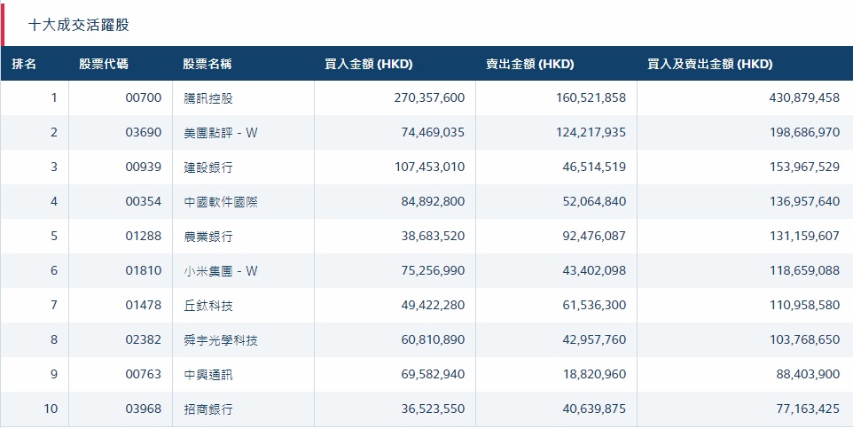 内银股再现分歧。建设银行(00939)获净买入2.01亿港元,而农业银行(01288)遭净卖出5379万港元。