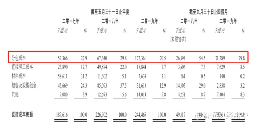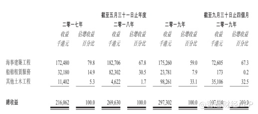 截至2019年5月31日止三个财政年度及截至2019年9月30日止4个月,公司实现营收2.16亿港元(单位下同)、2.7亿元、2.97亿元及1.08亿元;毛利率分别为13.2%、15.8%、17.8%及17.2%;期内溢利分别为2234万元、3298.8万元、2875.2万元及1274万元;海事建筑工程业务为公司的主要收入来源,占比分别为79.8%、67.8%、59%及67.3%。