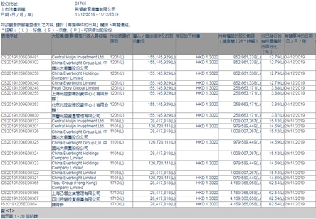 智通财经APP了解到,根据披露易官方数据显示,长达1年多大股东股权没有任何变动的希望教育,突然在2019年11月29日开启了股权连续变动模式。其中11月29日当天,陈育新、四川特驱、上海乙增共同组成持有的股权由之前的62.11%增至62.54%,方式是通过1.302港元每股价格增持2842万股,该股份是来自另一大股东珍荣环球;与此同时,同为大股东的中国光大控股、中央汇金共同持有的股份,也在当天以1.302港元价格买进1.27亿股后增至14.69%,再加上取得了2842万股股份的保证权益,持股比例上升至15.12%。