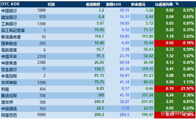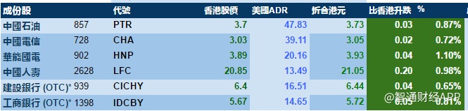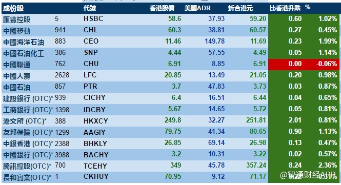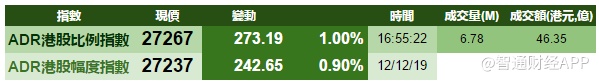 智通财经APP获悉,周四美股大幅反弹,刺激港股ADR指数全日做好,按比例计算,收报27267点,升273点或1%。