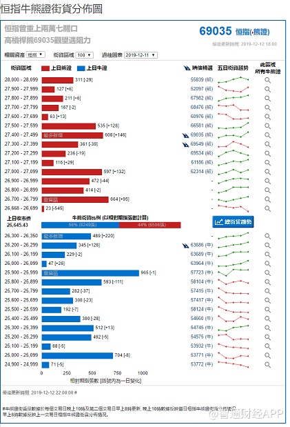 智通财经APP获悉,截至12月12日,恒指最新的牛熊街货比例56:44。瑞信恒指牛熊证街货分布图中的数据显示,熊证街货重货区在26700-26799区间,该区间最新熊证数量为664张,较上一交易日增加95张,最多新增在27400-27499区间,该区间最新熊证数量为608张,较上一交易日增加146张。牛证街货重货区在25900-25999区间,该区间最新牛证数量为965张,较上一交易日减少1张,最多新增在26300-26350区间,该区间最新牛证数量为489张,较上一交易日增加220张。
