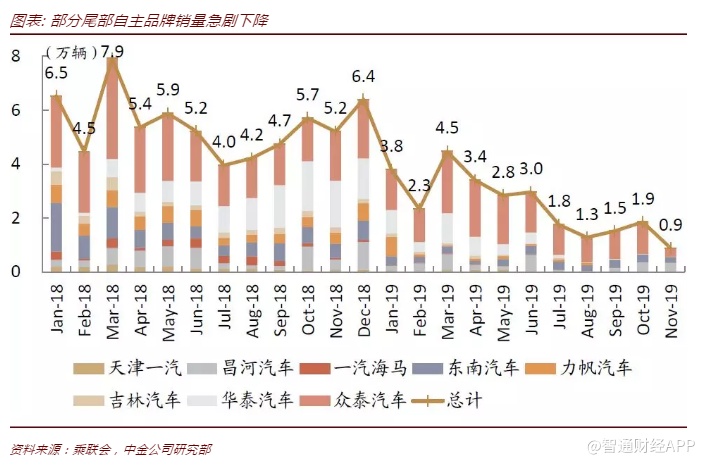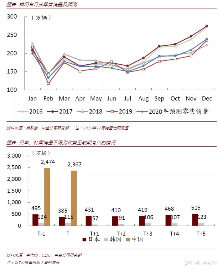展望2020年,受今年12月透支影响,我们预计1、2月销量环比回落幅度较大,但今年2-5月年化销量在1,900-2,100万辆、基数不高,因此月度同比仍可能实现正增长。从量化测算角度看,假设1月环比降幅在15%(2010-2018年平均环比降幅在6.9%,最大降幅在23.6%),后续月份按照2010-2018年平均环比增速计算,我们预计明年乘用车销量同比增速在3%左右。从驱动力角度看,我们认为低线城市的中低端需求复苏,是带动整体乘用车销量的核心动力。