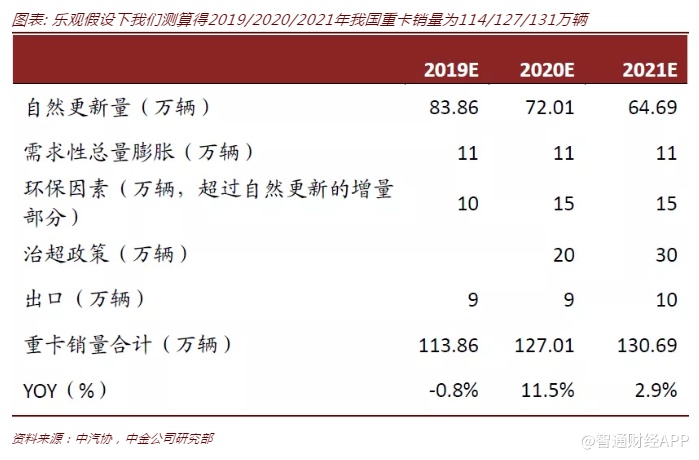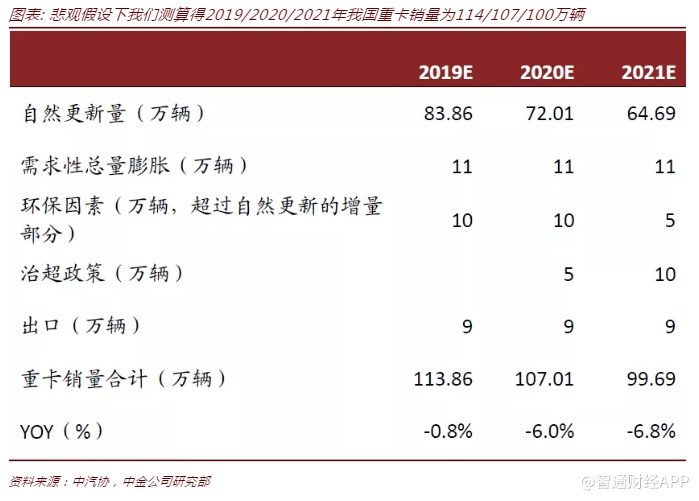 我们认为,环保和治超是未来两年重卡销量核心影响因素。环保因素或将缩短重卡实际使用寿命,以2018年底国内重卡保有量675万辆估计,扣减2015-2018年销售的国四、国五重卡及部分在2013年1月1日至2014年底销售的国四重卡,我们测算得2018年底国内国三及更早排放标准的重卡保有量为284万辆(含部分实际出清但未走报废流程的“僵尸车”)。