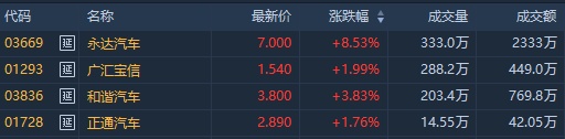 截至发稿,永达汽车(03669)涨9.92%,报7.09港元;和谐汽车(03836)涨4.1%,报3.81港元;广汇宝信(01293)涨3.31%,报1.56港元;中升控股(00881)涨3.16%,报31港元。