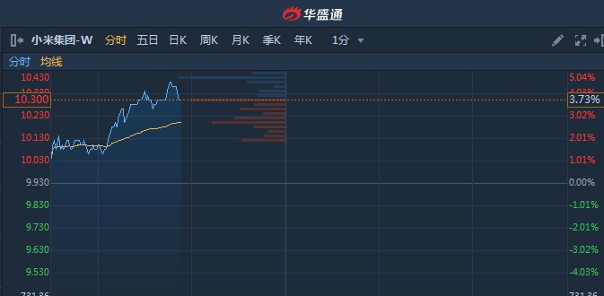 智通财经APP获悉,小米集团-W(01810)延续涨势,近期获北水持续加仓,盘中股价升破10港元,截至10时52分,涨3.93%,报价10.32港元,成交额15.58亿。值得注意的是,该股盘中高见10.4港元,创逾半年新高。