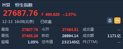 智通财经APP获悉,恒指早盘高开500.37点或1.85%,随后涨幅持续扩大,成交额激增,蓝筹股全线走强。截至收盘,恒生指数涨693.62点或2.57%,报27687.76点,创9月4日来最大涨幅,全日成交额达1171.42亿。国企指数涨2.1%,报10838.11点,红筹指数涨1.56%,报4394.22点。