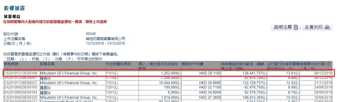 智通财经APP获悉,联交所最新资料显示,12月9日,三菱日联金融集团Mitsubishi UFJ Financial Group,Inc.增持维他奶(00345)125.2万股,每股作价28.1192港元,涉及总金额约为3520.52万港元。增持后最新持股数目约为1.384亿股,最新持股比例为13.01%。
