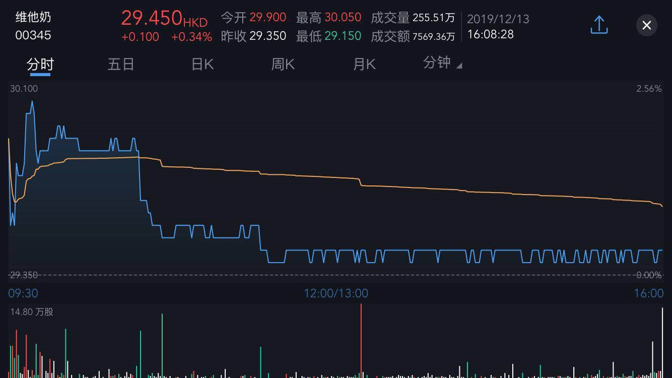 截至今日收盘,维他奶(00345)涨0.34%,报29.45港元。