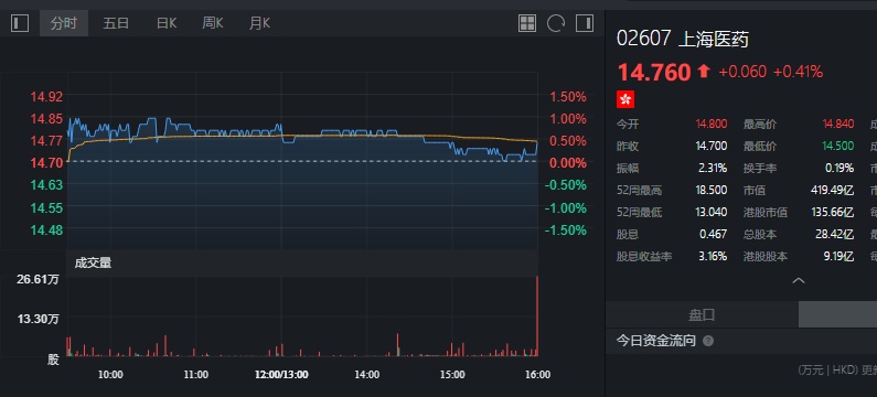 截至今日收盘,上海医药涨0.41%,报14.76港元。