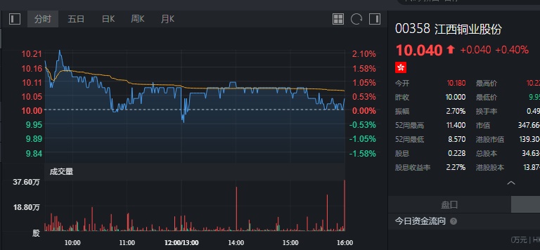 截至今日收盘,江西铜业涨0.4%,报10.04港元。
