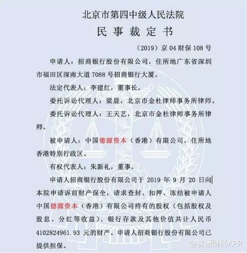 根据裁定书,招商银行曾于2019年9月20日向法院申请诉前财产保全,请求查封、扣押、冻结德源资本持有的股权、银行存款及其他价值共计人民币41.03亿元财产。