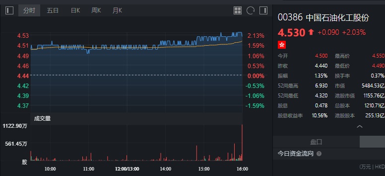截至今日收盘,中石化涨2.03%,报4.53港元。