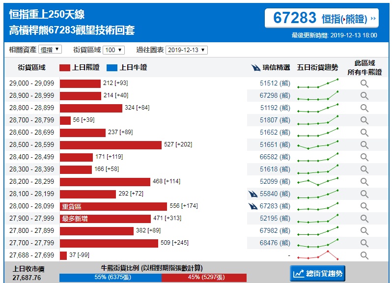 智通财经APP获悉,截至12月13日,恒指最新的牛熊街货比例55:45。瑞信恒指牛熊证街货分布图中的数据显示,熊证街货重货区在28000-28099区间,该区间最新熊证数量为556张,较上一交易日增加174张,最多新增在27900-27999区间,该区间最新熊证数量为471张,较上一交易日增加313张。牛证街货重货区在26300-26399区间,该区间最新牛证数量为678张,较上一交易日减少82张,最多新增在26400-26498区间,该区间最新牛证数量为426张,较上一交易日增加426张。