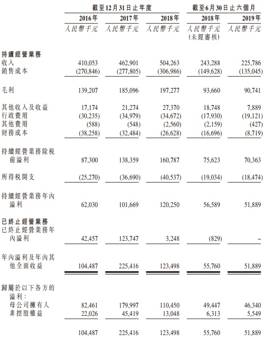 截至2018年12月31日止三个年度,公司录得稳步增长。公司持续经营业务的收入由截至2016年12月31日止年度的人民币4.1亿元增加至截至2017年12月31日止年度的人民币4.63亿元,并进一步增加至截至2018年12月31日止年度的人民币5.04亿元,复合年增长率为10.9%。公司持续经营业务的收入由截至2018年6月30日止六个月的人民币2.43亿元减少至截至2019年6月30日止六个月的人民币2.26亿元。