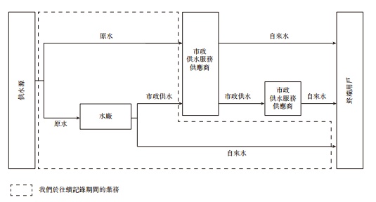 公司通过台州市供水系统(一期)及台州市供水系统(二期)在台州供应原水、市政供水及自来水。台州市供水系统(一期)供应原水,而台州市供水系统(二期)供应原水、市政供水及自来水。公司直接销售自来水予终端用户,包括商业用户、政府部门、工业用户及居民家庭。