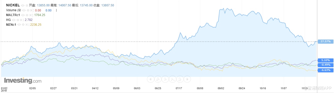 智通财经APP了解到,2019年,在主要的非铁贱金属中,镍价以惊人涨幅持续领跑。今年迄今,镍期货的价格涨幅接近28%。相比来看,铜期货、铝期货、以及锌期货的价格表现则大为逊色,年初至今的涨幅分别仅为5.1%、-0.49%、-6.63%。