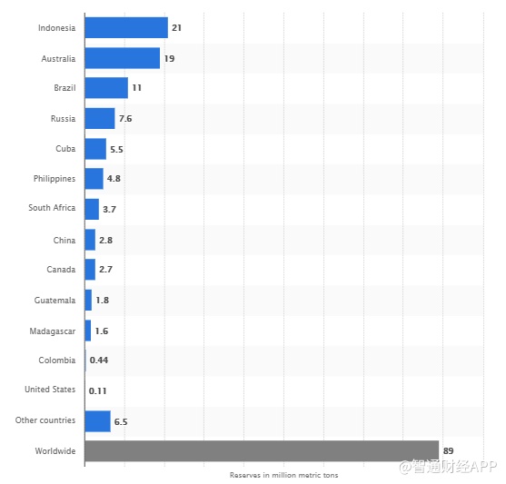 在产业链上游中,红土镍矿对应成分为氧化镍,全球储量占比60%;硫化矿对应成分为硫化镍,占比40%。根据Statista数据,2018年全球镍储量约为8900万吨。其中,印度尼西亚储量位居第一,达2100万吨,占比约24%,是镍资源最丰富的国家。澳大利亚、巴西、俄罗斯、古巴、菲律宾分别排名2-6位。中国的镍储量为280万吨,位居第八。