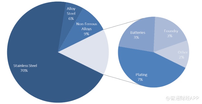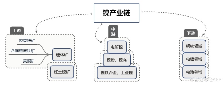 镍产业链的上游为镍矿资源,分为红土镍矿和硫化矿两类。硫化矿还可细分为镍黄铁矿、含镍磁流铁矿、黄铜矿。产业链的中游主要是含镍中间产品,主要有电解镍、镍粉、镍丸、镍铁合金、工业镍等。下游则是其它应用产业,如钢铁、电镀、电池领域等。