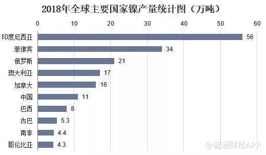 另外值得注意的是国家是菲律宾。尽管菲律宾的储量(480万吨)位列全球第六,但2018年该国却以34万吨的产量位居第二。此外,澳大利亚镍储量位居第二(1900万吨),但产量却排在第六位,2018年仅为16万吨。