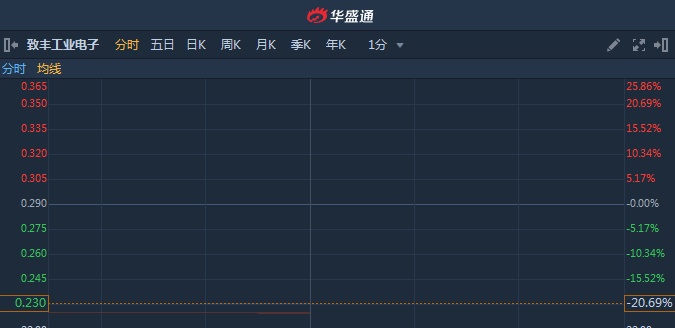 智通财经APP获悉,致丰工业电子(01710)发盈警,年度股东应占溢利预跌40%-60%,早盘跳空低开,暂居跌幅榜首位。截至9时20分,跌20.69%,报价0.23港元,成交额5.06万。