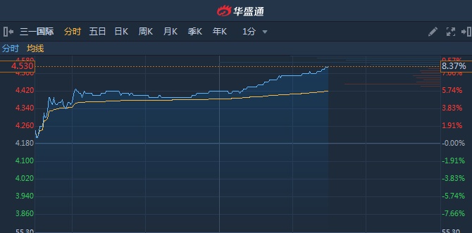 智通财经APP获悉,三一国际(00631)盘中股价放量大涨,一度高见4.53港元,创七年半新高,截至14时28分,涨8.37%,报价4.53港元,成交额5390万。值得注意的是,该股近日获第一上海看高至5.84港元,首予“买入”评级。
