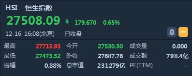 智通财经APP获悉,恒指早盘低开157.26点或0.57%,报27530.5点。截至收盘,恒生指数跌179.67点或0.65%,报27508.09点,全日成交额达798.4亿。国企指数跌0.55%,报10778.89点,红筹指数跌0.04%,报4392.62点。