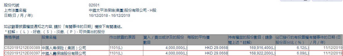 智通财经APP获悉,联交所最新资料显示,12月11日,中国人寿保险股份有限公司增持中国太平洋保险股份有限公司(02601)400万股,每股作价29.0668港元,总金额约为1.16亿港元。增持后最新持股数目约为16892.22万股,最新持股比例为6.09%。
