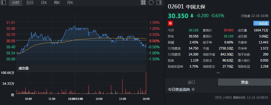 截至今日收盘,中国太保跌0.65%,报30.35港元。