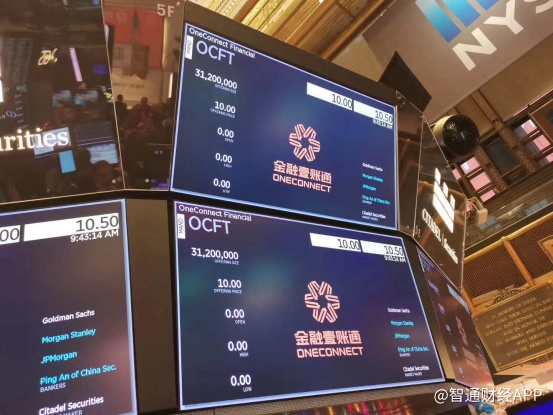 12月13日,金融科技“独角兽”金融壹账通(OCFT.US)正式登陆纽交所。公司敲钟后,开盘报价10.15美元,盘中股价最高涨至10.71美元,涨幅达7.1%,后收盘价为10.08美元,微涨0.8%。