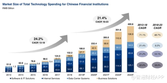 智通财经APP了解到,中国作为全球第二大经济体,正在蓬勃发展的金融业为金融科技服务市场发展提供了强大的支撑。数据显示,22018年中国金融机构的技术支出市场规模已超千亿,达到1522亿元。并且预计2019-2023年,该市场规模将继续保持上个5年的高增长态势,复合增长率达到21.4%,并最终在2023年形成一个高达4008亿规模的市场。