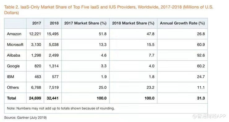 在IaaS的全球市场份额上,AWS占据了47.8%份额,第二名微软(MSFT.US)Azure是15.5%份额,阿里云(BABA.US)则是7.7%份额,谷歌云(GOOG.US)是4%份额,IBM(IBM.US)是1.8%份额,其他云厂商是23.2%的剩余市场。