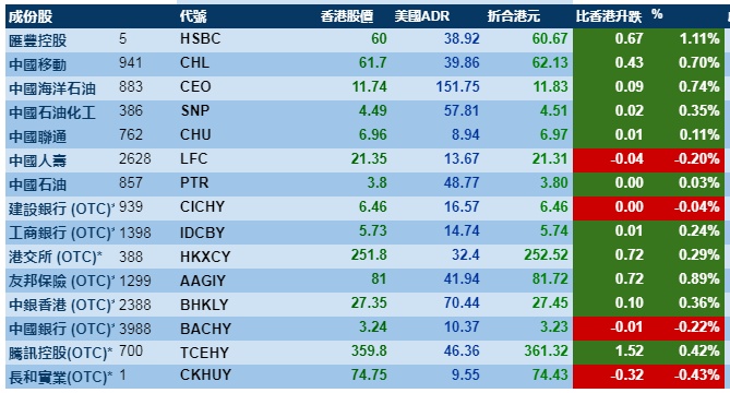 智通财经APP获悉,12月17日,纳指、标普500指数收盘再创新高,刺激港股ADR指数全日造好,按比例计算,收报27628点,涨120.5点或0.44%。大型蓝筹涨跌不一,汇丰控股收报60.67元,较港收市升0.67元;腾讯控股收报361.32元,较港收市升1.52元。