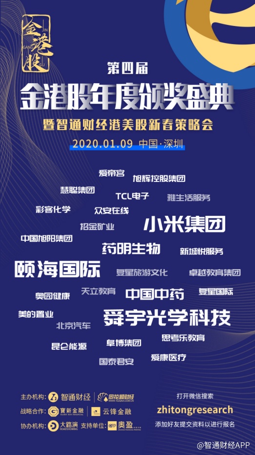 “第四届金港股年度颁奖盛典暨智通财经港美股新春策略会”将于2020年1月9日在深圳开启。